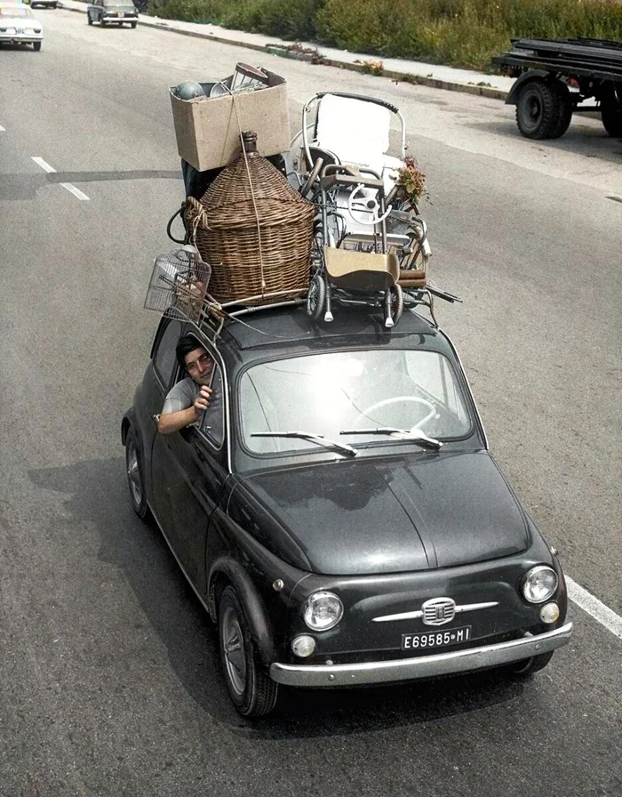 Семья в автомобиле Fiat 500 едет на летние каникулы, Италия, 1967 год.