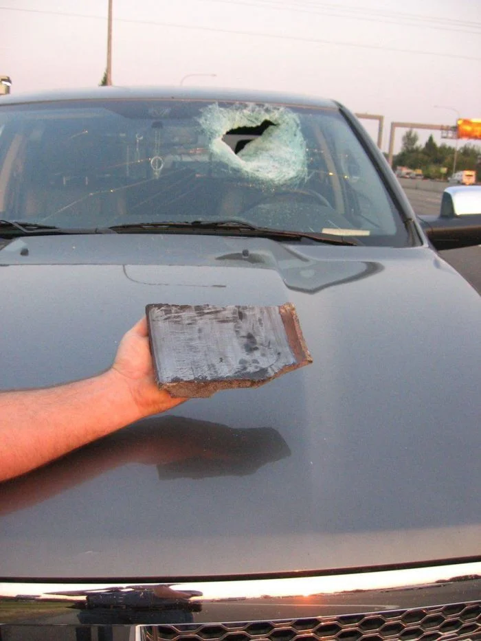 Кусок мусора пробил лобовое стекло. Но водитель вовремя заметил приближающийся предмет и смог увернуться, так что он не попал ему в лицо или голову.