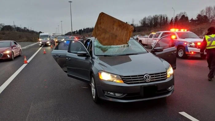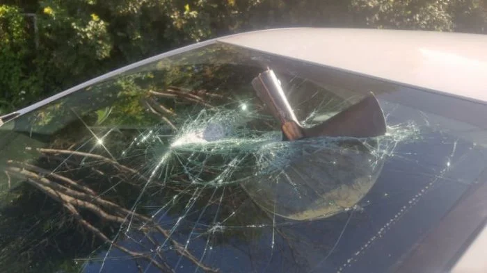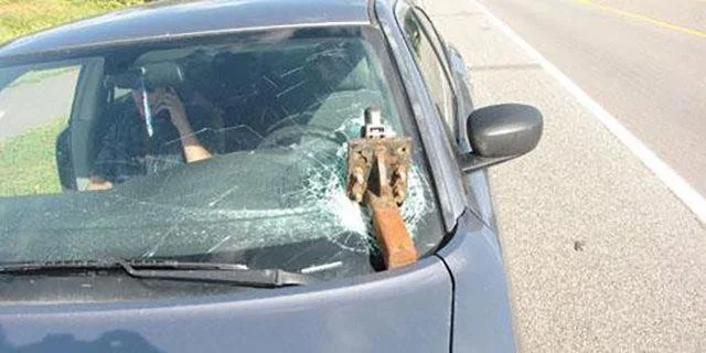 Доска пробила лобовое стекло и остановилась в нескольких сантиметрах от лиц водителя и его пассажира.