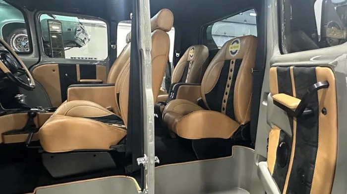 Интерьер отделан натуральной кожей и замшей. Сзади установлены два отдельных кресла-«полуковша» без подголовников. Кастом оснащён цифровой приборкой, современными системами кондиционирования и мультимедиа.