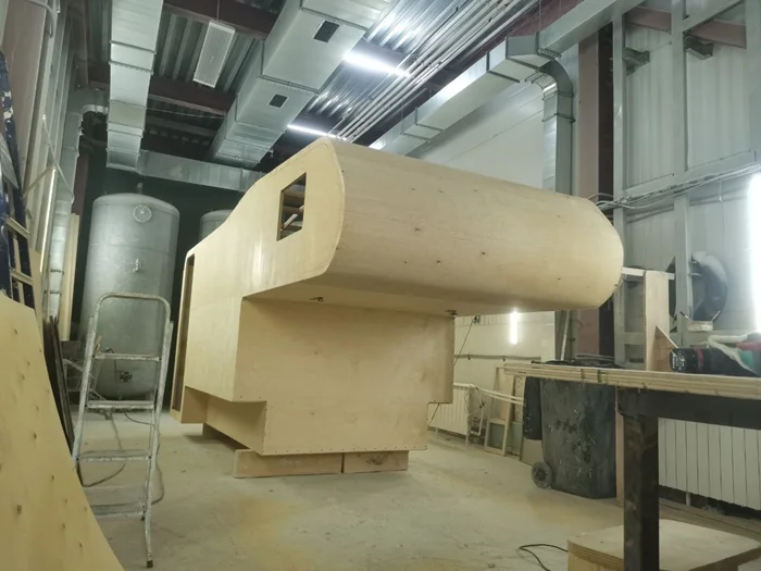 Итак, согласование пройдено и мы приступили к стройке. Напилили и собрали каркас из влагостойкой фанеры толщиной 21 мм. Для облегчения выпиливаем из нее все лишнее, оставляя только необходимые силовые элементы и закладные. Проемы окон оставляем на потом.