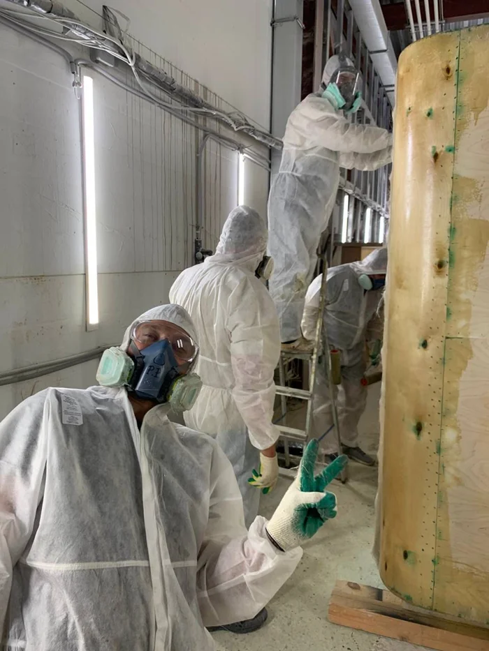 После идут долгие часы шпаклевания, шлифовки... Идет подготовка к покрытию гелькоутом. И вот первый слой. Он еще просвечивается, но после 3 слоя корпус будет белоснежный как скорлупа яйца.