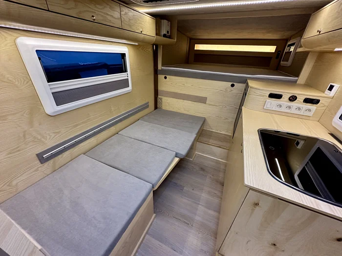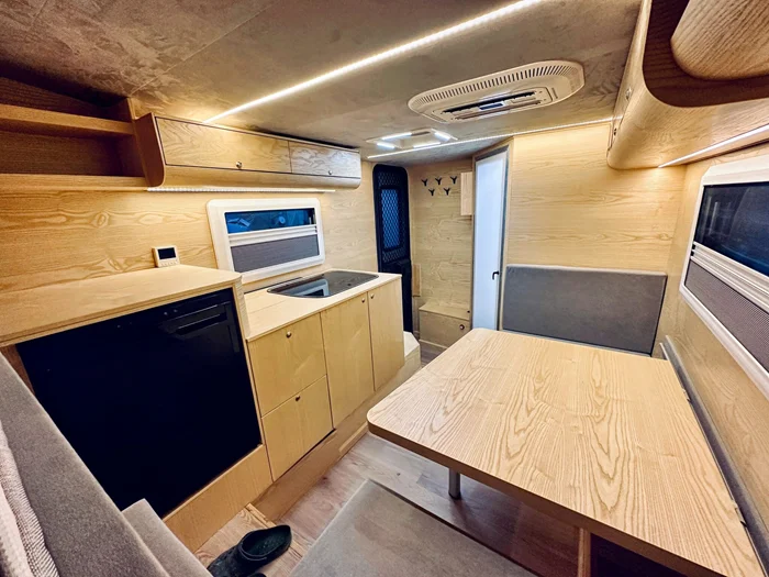 Решили с заказчиком какая будет планировка. То что у этих грузовиков низкие борта, позволило нам сделать столовую зону вдоль боковой стены.