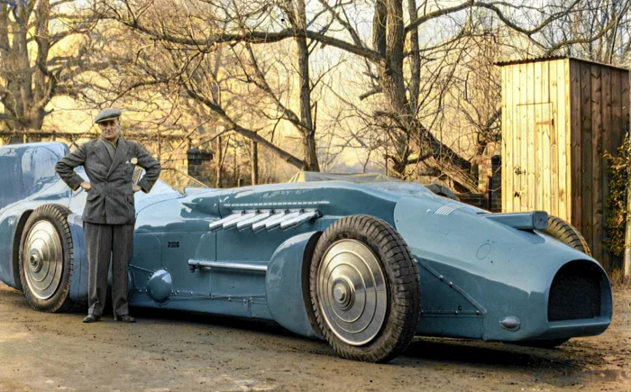 Этот автомобиль, разработанный сэром Малькольмом Кэмпбеллом, установил рекорд скорости на суше — 438 км/ч, оснащенный 36-литровым двигателем Rolls-Royce V12 мощностью 2500 л.с.
