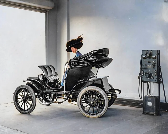 Электромобиль на зарядке, 1912 год.