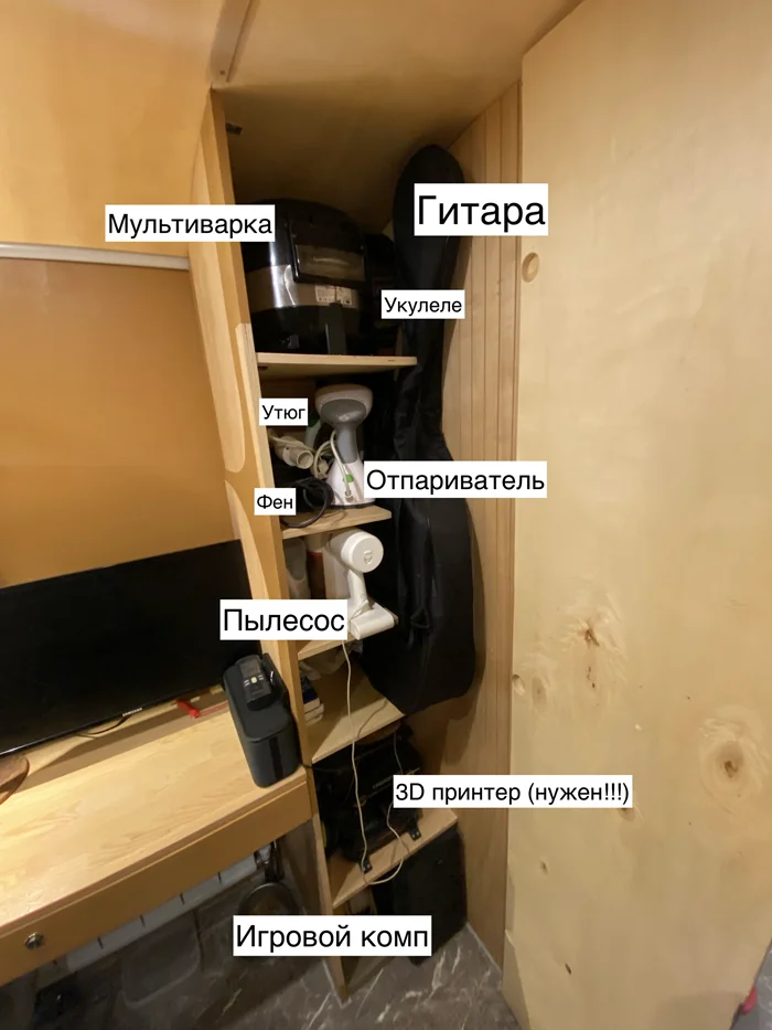 Плюс: Мало места, следовательно, нигде не лежат эти давящие на психику очень важные 45е шлепанцы или маска из Египта, в который ты нескоро снова поедешь. Расхламление рулит! А ещё протянул руку - и все достал. А уборка занимает где-то 11,5 минут.