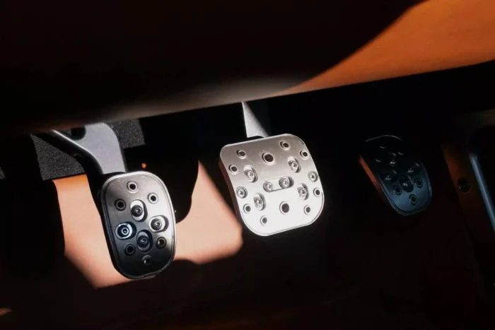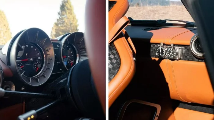 Кузов GT Super Jarama, выполненный из углепластика, установлен на алюминиевом шасси, покрыт глубоким синим оттенком Blu Cervino и украшен фирменными эмблемами, созданными с ювелирной точностью. Интерьер, обшитый высококачественной кожей Connolly Cognac, дополнен анодированным алюминием и карбоновыми элементами. Два винтажных хронографа Tag Heuer и рычаг переключения передач с открытым механизмом напоминают о спортивных традициях.