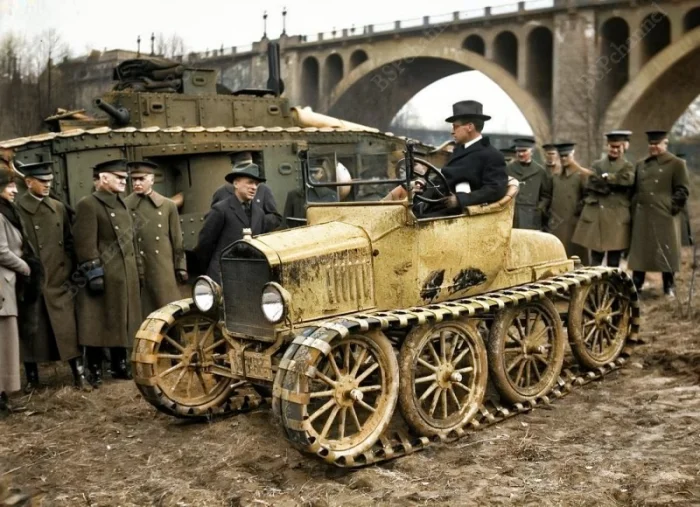 На фотографии 1920 года изобретатель Чейз демонстрирует офицерам американской армии свой вариант гусеничного движителя. Время после Первой мировой войны стало эпохой экспериментов с гусеничным транспортом - конструкторы предлагали различные решения, как превратить обычный автомобиль в вездеход.