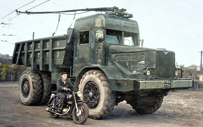 Троллейвоз МАЗ-525 ХТТУ построенный на базе карьерного самосвала грузоподъемностью 25 т. СССР, 1950-е.