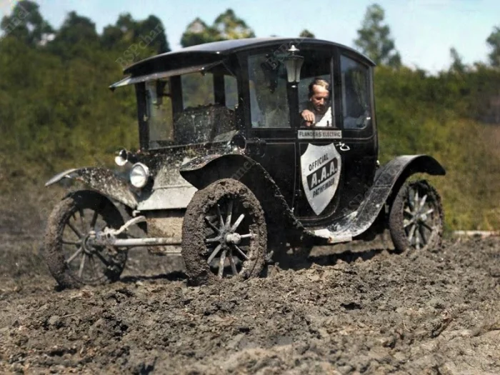 На автомобиле видна эмблема с инициалами ещё молодого American Automobile Association (AAA) - автомобильного клуба, который в те годы только начинал свой путь.