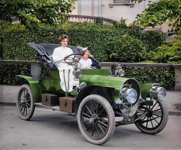 На фотографии за рулём ретро-родстера Franklin Model D 1907 года изображены жена и дочь Фрэнка С. Бливена, официального дилера марки Franklin в Вашингтоне.
