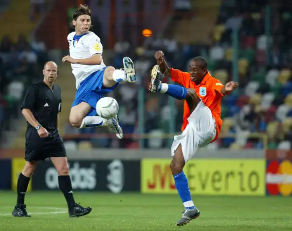 Italy and Holland fight for posession during the 2006 UEFA European Under 21 Championship Group B match between Italy and Holland at the Estadio Municipal de Aveiro, in Aveiro, Portugal on May 29, 2006. Holland won 1-0 and moves on to the semifinals.