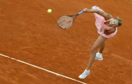 Maria Sharapova hits a serve to Mashona Washington in the women's singles of the 2006 French Open at Roland Garros Stadium, Paris, May 28, 2006. Sharapova defeated Washington 6-2, 5-7, 7-5.