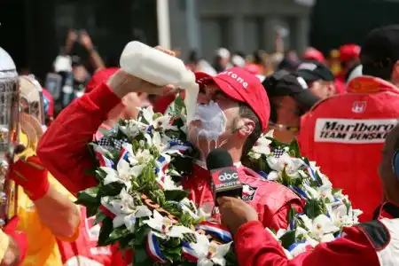 Sam Hornish Jr celebrates winning the 90th Indianapolis 500 at the Indianapolis Motor Speedway, May 28, 2006. Hornish passed 19-year-old Marco Andretti on the final lap to win the race.
