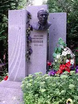 Анатолий Дмитриевич родился в смоленском городе Вязьма в 1922 году. Переехал с родителями в Москву, работал токарем на заводе, занимался в самодеятельности. С первых дней войны - на фронте. Командовал взводом зенитной артиллерии. Старший сержант. В 42-м тяжело ранен под Харьковом. В двадцать один год - инвалид. В 1946 окончил актёрский факультет ГИТИСа, с 1949 актёр Московского театра Сатиры. Яркий, выразительный, многогранный, характерный актёр, Папанов наряду с комедийными и гротесково-сатиричными ролями создал ряд образов положительных героев. Роли: Пустославцев (" Лев Гурыч Синичкин" Ленского), Почесухин (" Памятник себе" Михалкова), Боксёр ("Дамоклов меч" Хикмета), Шафёр, Англичанин и Вельзевул (" Клоп", "Мистерия-буфф" Маяковского), Бродский ("Интервенция" Славина), Сысоев ("У времени в плену" Штейна), Городничий ("Ревизор" Гоголя) и другие. Снимается в кино: Антон Севастьянович ("Порожний рейс", 1963), Иванов ("Наш дом",1965), Семён Васильевич ("Берегись автомобиля", 1966), Дубинский ("Белорусский вокзал", 1971). Крупнейшая работа - Серпилин в фильмах "Живые и мёртвые" (1964) и "Возмездие" (1969). Государственная премия РСФСР им. Братьев Васильевых (1966). Посчитаем. На сцене Русского драматического театра в Клайпеде (цел ли в "капиталистической" Литве такой театр сейчас?) Анатолий Дмитриевич Папанов в далеком послевоенном 47-м году сыграл первую в своей жизни роль - самого Сережки Тюленина в спектакле "Молодая гвардия". Ведь в жизни и по роману Фадеева Сергею Тюленину, легенде послевоенных мальчишек, было всего 15 лет! Как молод был Папанов, если сыграл юношу героя! Последней работой Анатолия Дмитриевича была роль Гицэ в спектакле "Рыжая кобыла с колокольчиками" - это уже в Московском Государственном Академическом театре Сатиры, которому Папанов отдал без малого 40 лет творчества. Всего в театре Сатиры Анатолий Дмитриевич создал ровно 50 образов, и среди них были такие знаменитые в разные годы постановки, как "Свадьба с приданым", "Клоп", "А был ли Иван Иванович?", "Дамоклов меч", "Тёркин на том свете", "Ревизор", "Горе от ума", "Бег", "Гнездо глухаря".