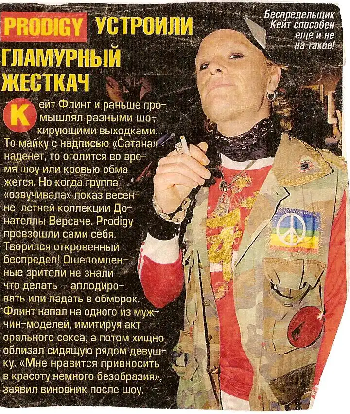 Роль в группе: танцор, вокал. Кейт, пожалуй, самая известная личность в группе. Кейт - лицо Prodigy. Прежде всего, это связанно с его внешним видом и странной манерой поведения на сцене. Практически все части на теле у Кейта проколоты и разрисованы различными татуировками. На живых выступлениях группы Флинт ведет себя как сбежавший из психушки маньяк: он всячески пытается разогреть толпу, иногда даже обливая зрителей водой или оплевывая их. Он даже как-то предложил поджечь себя на одном из выступлений группы, но его, слава Богу, отговорили. В детстве Кейт обожал Pink Floyd и всю британскую рок культуру. Об этом также свидетельствует его имидж тех времен: длинные волосы, кожаная куртка. Кейт много путешествовал на своем мотоцикле и объездил огромное количество разных мест. В 80-е он, как и другие участники Prodigy, увлекся рейв культурой и не пропускал ни одной рейв-вечеринки. Но, несмотря на имидж психопата, Кейт очень добрый и отзывчивый человек. Одно из его любимых увлечений возится в саду. Но вот чем действительно болен Кейт, так это мотогонками. Мотоцикл для него - это ВСЕ! Я думаю, все помнят, как Кейт напугал всех поклонников Prodigy, едва не разбившись на мотоцикле. Это случилось как раз за пару недель до концерта в Питере.