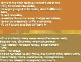 • Речь Милен Фармер на церемонии вручения: "Мне бы хотелось прежде всего вам сказать, что эта награда - для меня большая честь, даже если идея награждения для меня немного чуждая... Я бы хотела поблагодарить публику за то, как они приняли этот альбом. Для меня каждый альбом - это частичка жизни, положенная на музыку. Создание этого альбома было более трудным, чем предыдущих, возможно, из-за страха, что не найдутся те, кто его полюбят... из-за страха разочаровать... Я выбрала в жизни эту профессию... Мне повезло в течение многих лет найти какой-то отклик, диалог, иногда даже общность... (Овации в зале) Спасибо... И наконец, я хотела бы сказать, что я влюблена в слова. Я люблю их делить с другими... с Другим! Я люблю этот момент и я люблю всех, кто меня любит. Спасибо огромное!"