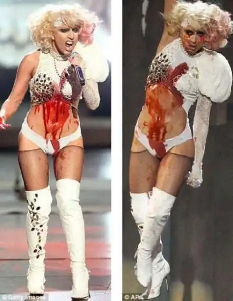 Впрочем, певица шокировала поклонников не только костюмом, но и своим выступлением - она изобразила собственную смерть в кровавом шоу. Как сообщает Federal Post, теперь артистку обвиняют в пропаганде суицида.