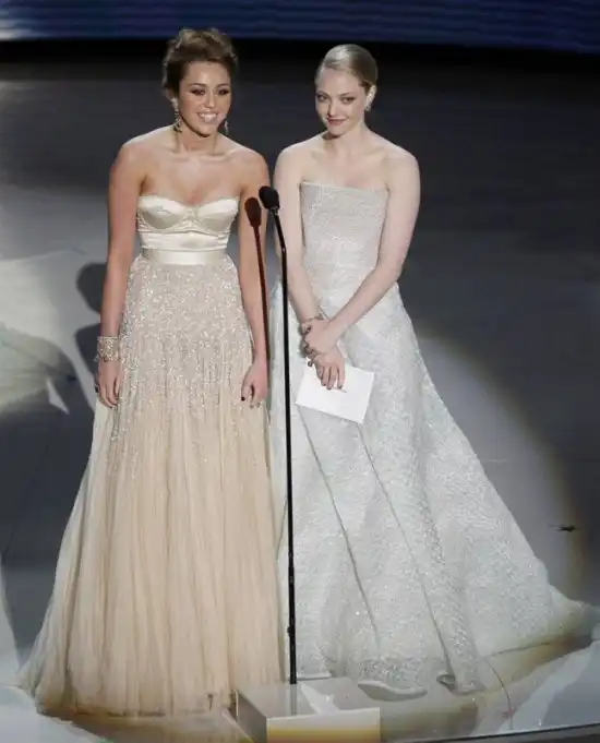20. Майли Сайрус и Аманда Сейфрид представляют номинантов на Оскар в категории «лучший саундтрек», который ушел певцу Ти-Боун Бернету и Райяну Бингэму за песню из фильма «Безумное сердце». (Gary Hershorn / Reuters)