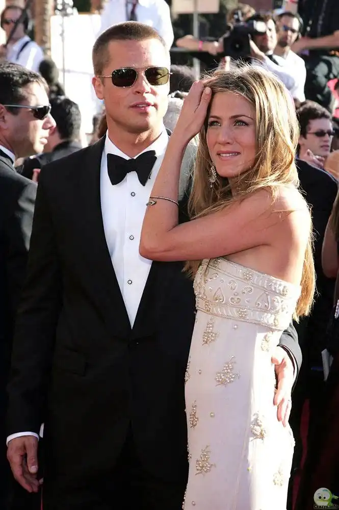 Питт и Энистон на 51-ой ежегодной церемонии вручения премии Эмми 12 сентября 1999 года в Лос-Анджелесе. Пара познакомилась в 1998 году, а 29 июля 2000 года в Малибу состоялась закрытая церемония их бракосочетания.