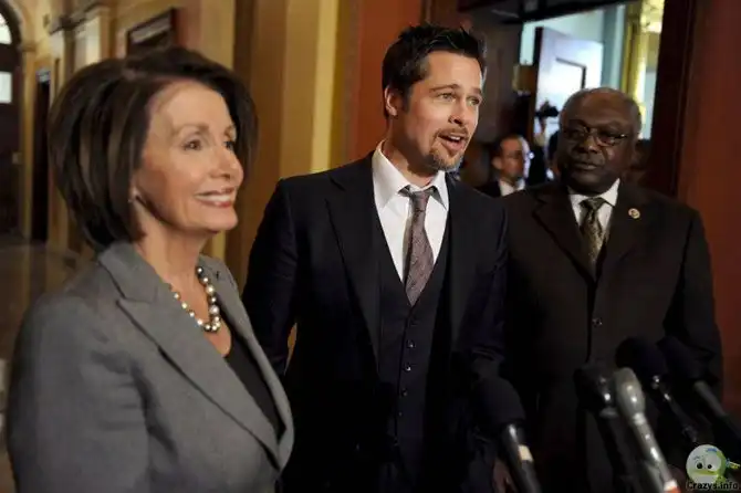 Питт со спикером палаты представителей США Ненси Пелоси (слева), и конгрессменом Джеймсом Клайберном (справа) дает интервью журналистам в здании конгресса США после заседания, на котором обсуждались вопросы реконструкции Нового Орлеана, Вашингтон, 5 марта. Администрация Обамы объявила, что понадобится около 438 миллионов долларов, чтобы устранить все последствия урагана Катрина.