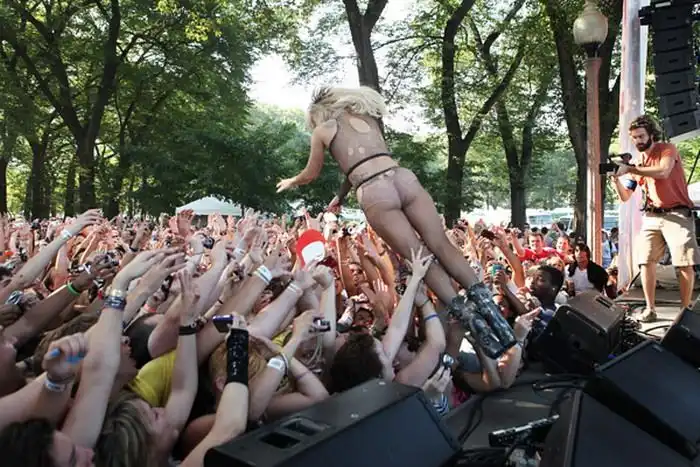 Полуголая Lady Gaga во время недавнего концерта решила покататься на толпе. Странно, что ее не изнасиловали. Судя по фотографиям, все к этому и шло )
