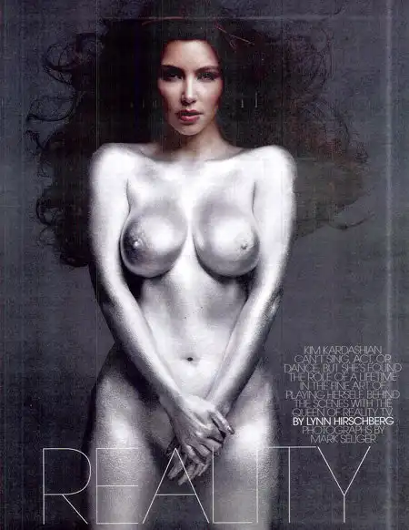 В 2007-м Ким уже обнажалась для Playboy, однако, потом заявила, что очень жалеет об этом - ей было неловко и некомфортно. Видимо, модный журнал – это совсем другое дело. Так, красотка предстала без одежды на обложке его ноябрьского номера. На страницах издания Ким также появляется обнаженной - ее тело покрыто только тонким слоем серебряной краски.