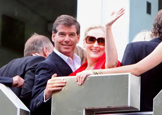 Пирс Броснан и Мэрил Стрип приветствуют поклонников на мировой премьере мюзикла «Мамма Миа!» в Лондоне. 30 июня 2008 года.