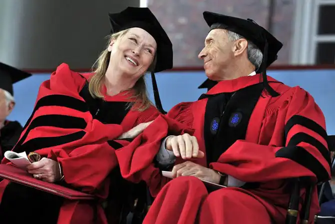 Мэрил Стрип беседует с бывшим верховным судьёй Дэвидом Соутером после церемонии присвоения учёных степеней в Гарвардском университете в Кембридже, штат Массачусетс, США, 27 мая 2010 года.