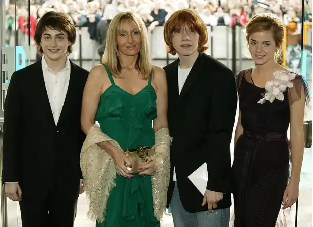 30 мая 2004 года. Дэниэл Рэдклифф, Джоан Кэтлин Роулинг, Руперт Грин и Эмма Уотсон на британской премьере фильма «Гарри Поттер и узник Азкабана» в кинотеатре Одеон.