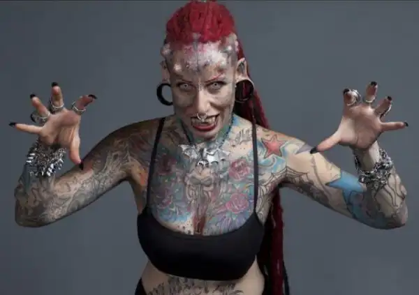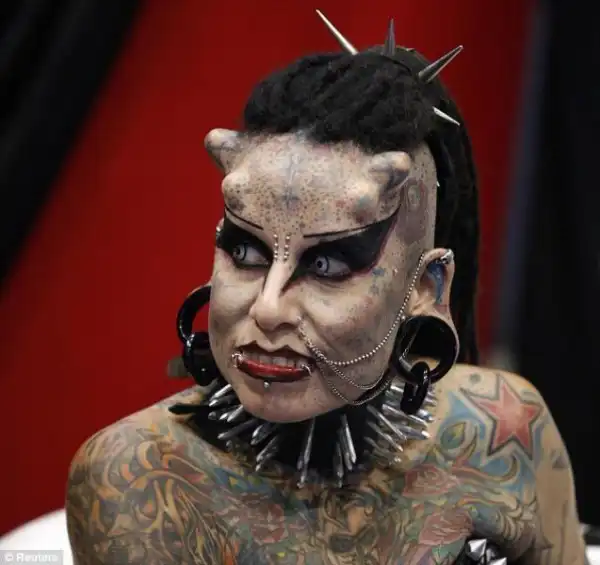У этой 35-летней жительницы города Zapopan (штат Jalisco) 98 процентов тела покрыто татуировками, а кроме этого, имеется множественный пирсинг лица, шесть тефлоновых имплантантов, вживленных под кожу на груди и руках, четыре маленьких рога на голове, четыре клыка, и разделенный на две части язык.