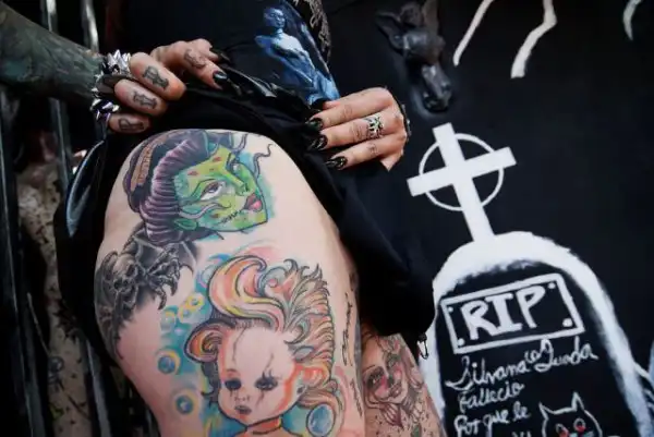 И уже в 14 лет на теле девушки появилась первая татуировка (рогатый череп), которую она долгое время удачно скрывала под школьной формой