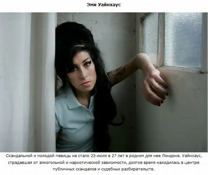 Как рука у Вас поднялась вставить в данный пост наряду с ВЕЛИКИМИ весьма сомнительную "звёздочку" Уайнхаус?!Я не любитель оставлять комментарии,но возмущению моему предела нет.