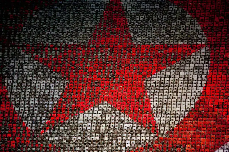 17. Карточки на стадионе Пхеньяна во время майских праздников изображают национальный флаг страны. (AP Photo/David Guttenfelder)