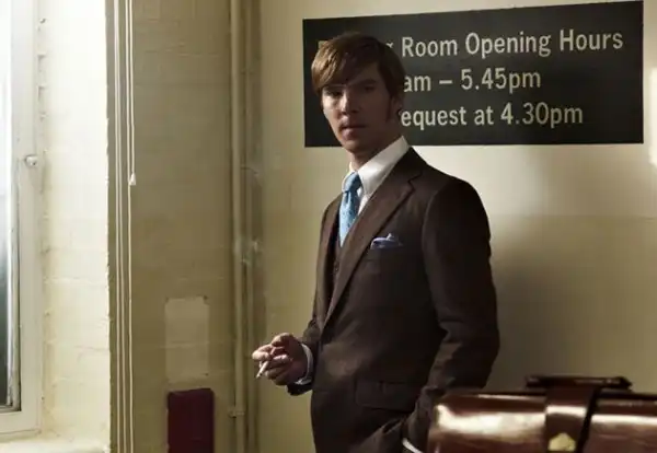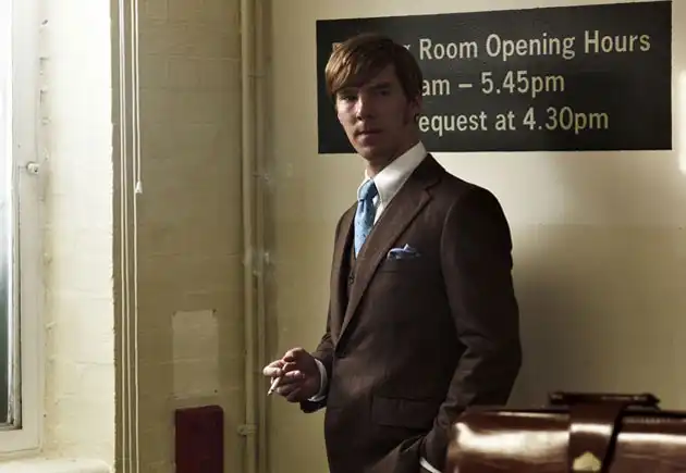 Бенедикт Камбербэтч в роли сотрудника британской разведки 1970-х в фильме «Шпион, выйди вон». Герой Камбербэтча Питер Гиллем — самый молодой и модный из персонажей фильма, не избегает ярких галстуков, нагрудных платков в тон, и широких брюк.