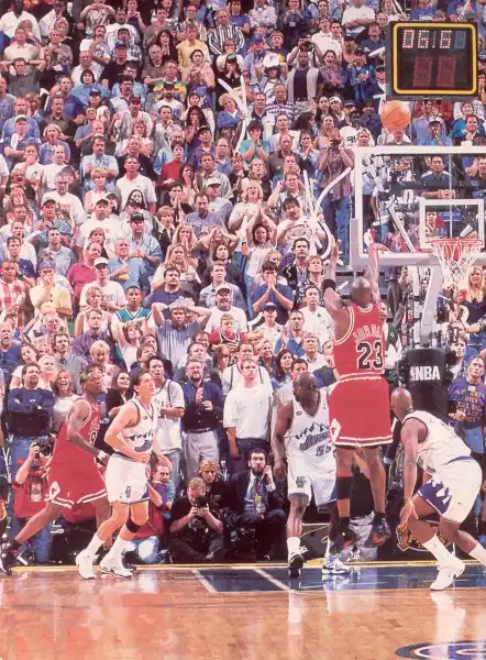 «Чикаго» вернулось в Юту на шестой матч финала 14 июня 1998 года, выигрывая в серии со счетом 3-2. На последних минутах Джордан обокрал Карла Мэлоуна[87] и, пройдя с дриблингом через всю площадку, забил победный мяч. Он обманул финтом Брайна Рассела, также как и год назад, на последних секундах первого матча Финальной серии 97 года между Ютой и Чикаго. Джон Стоктон попробовал спасти матч, но не забил трёхочковый мяч на последней секунде. Майкл Джордан по окончании Финала НБА поднял над головой руки, показав на этот раз шесть пальцев — он привел свою команду к шестому чемпионскому титулу. Этот момент был признан величайшим в истории плей-офф НБА.[87] Джордан был признан MVP финала,[57] набирая в среднем 33,5 очков за игру. Финал НБА до сих пор считается самым рейтинговым телевизионным событием, а шестая игра собрала максимальную телеаудиторию в истории НБА.