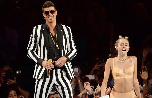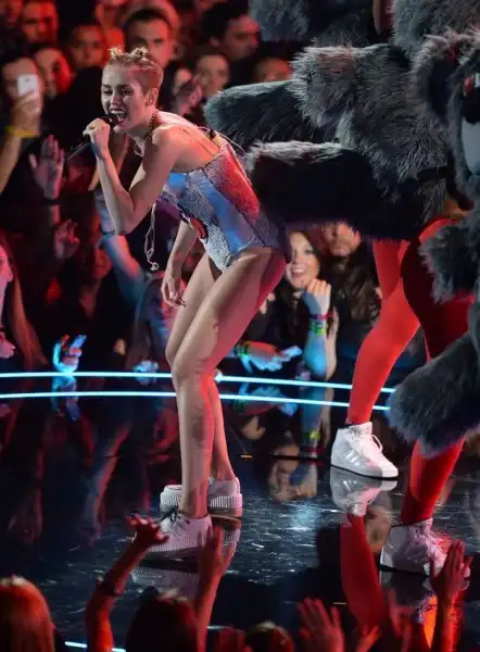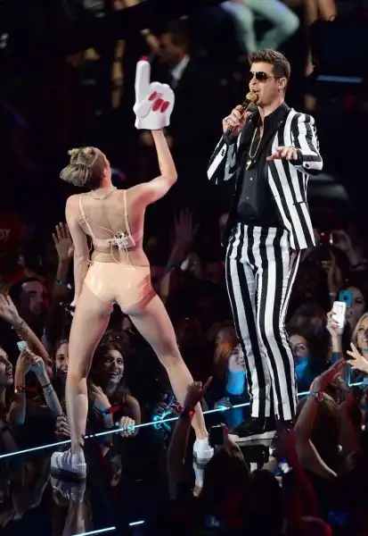 Майли Сайрус - американская певица, которая прославилась благодаря роли школьницы в сериале "Ханна Монтана". Так вот, эта милая девочка, которая принесла компании "Дисней" кучу бабла, решила показать, что она повзрослела, и устроила скандальное выступление на церемонии 2013 MTV Video Music Awards. В двух словах, 20-летняя "звездочка" вышла на сцену буквально в трусах и лифчике, стала раком и начала тереться задом о хозяйство Робина Тика - 36-летнего женатого мужика. В общем, вела себя как дешевая шлюшка.
