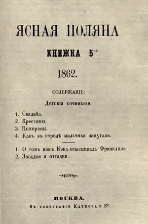 С 1862 года Толстой стал издавать педагогический журнал «Ясная Поляна», где главным сотрудником являлся он сам. Не испытывая призвания издателя, Толстой сумел выпустить только 12 номеров журнала, последние из которых появились с отставанием в 1863 году. Помимо статей теоретических, он написал также ряд рассказов, басен и переложений, адаптированных для начальной школы. Соединённые вместе, педагогические статьи Толстого составили целый том собрания его сочинений. В своё время они остались незамеченными. На социологическую основу идей Толстого об образовании, на то, что Толстой в образованности, науке, искусстве и успехах техники видел только облегчённые и усовершенствованные способы эксплуатации народа высшими классами, никто не обратил внимания. Мало того: из нападок Толстого на европейскую образованность и «прогресс» многие вывели заключение, что Толстой — «консерватор».