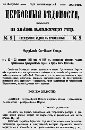 24 февраля (ст. ст.) 1901 года в официальном органе синода «Церковные ведомости, издаваемыя при святейшем правительствующем синоде» было опубликовано «Определение святейшего синода от 20—22 февраля 1901 г. № 557, с посланием верным чадам православныя грекороссийския Церкви о графе Льве Толстом».