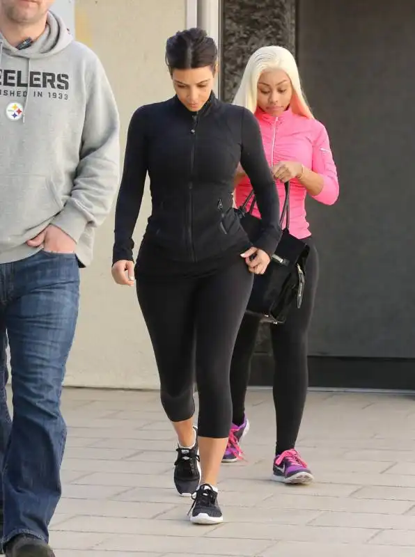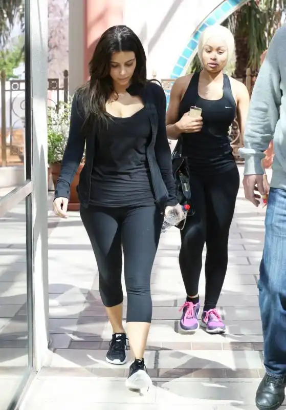 По сравнению с задом Блэк Чайны даже знаменитые на весь мир ягодицы Ким кажутся скромными, однако их дружбе это не мешает, поэтому девушки регулярно бывают замечены вместе. На этот раз они отправились в спортзал в обтягивающих фигуры спортивных костюмах. Ким, которая 24 мая в Париже сыграет свадьбу с рэпером Канье Уэстом, была одета в форму американского бренда одежды для йоги и фитнеса Lulu Lemon.