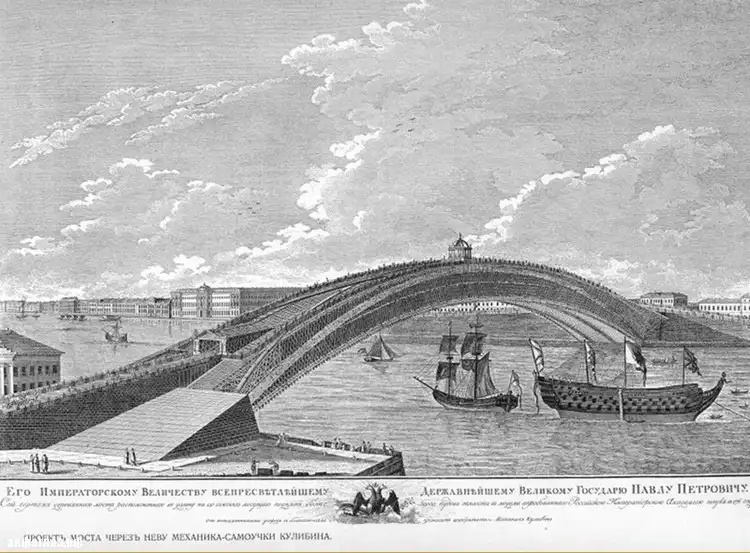 И. П. Кулибин обратил внимание на неудобства, вызываемые отсутствием в его время постоянных мостов через р. Неву. После нескольких предварительных предложений он разработал в 1776 г. проект арочного однопролётного моста через Неву. Длина арки — 298 метров. Арка была спроектирована из 12 908 деревянных элементов, скреплённых 49 650 железными болтами и 5 500 железными четырёхугольными обоймами.