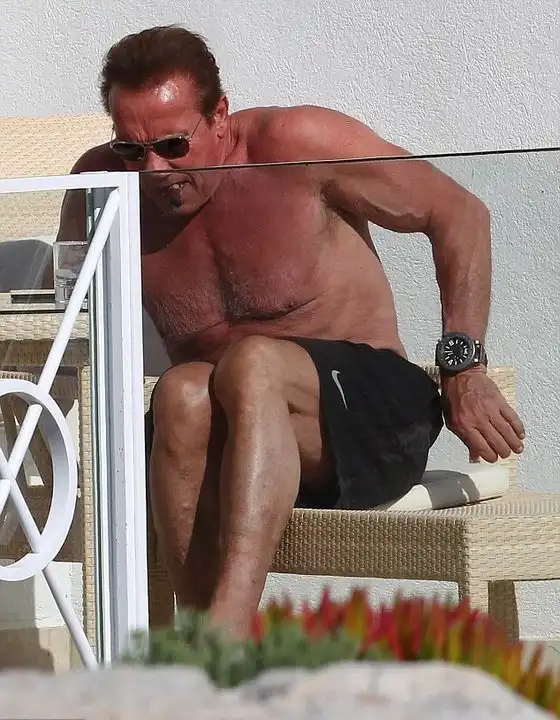 Он грелся на солнце топлес в черных шортах, сидя на плетёном кресле. В тот же день знаменитый актёр продемонстрировал свою юношескую энергию и для исполнения импровизированного танца вытащил не менее известного коллегу 67-летнего Сильвестра Сталлоне. Они вместе исполнили вальс в ночном клубе "Gotha" во время рекламной акции боевика "Неудержимые 3". Для торжественного мероприятия Шварценеггер принарядился в изящный бежевый костюм, а Сталлоне решил выделиться из звездной толпы с помощью фиолетового пиджака.