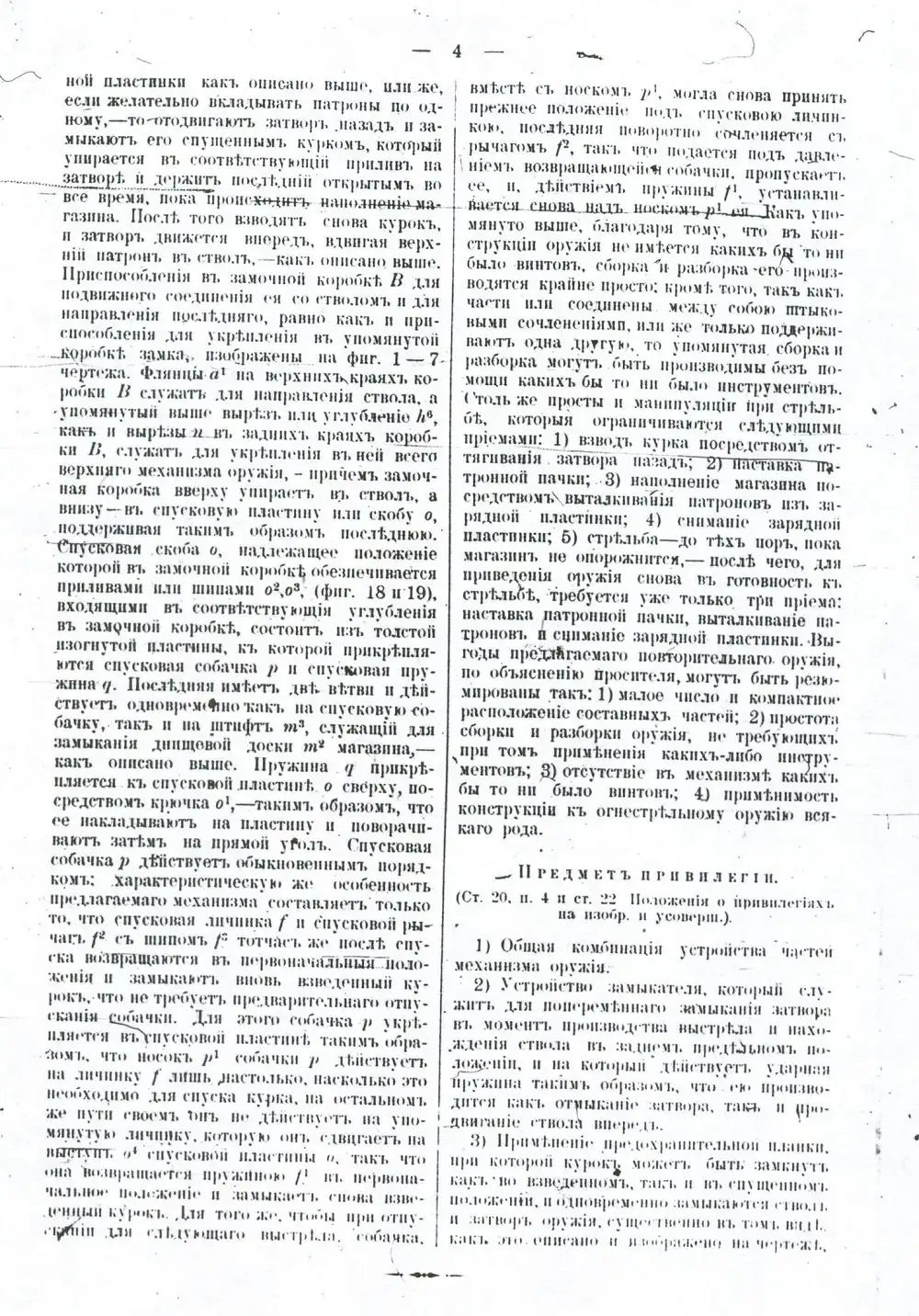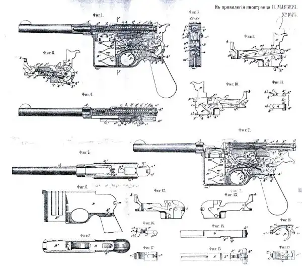 Кстати вот несколько страниц из привилегии №1675, выданной в России 31 января 1899 года со схемой и описанием «репитирного оружия действующего отдачею с подвижным стволом и замыканием затора» на пистолет П. Маузера.