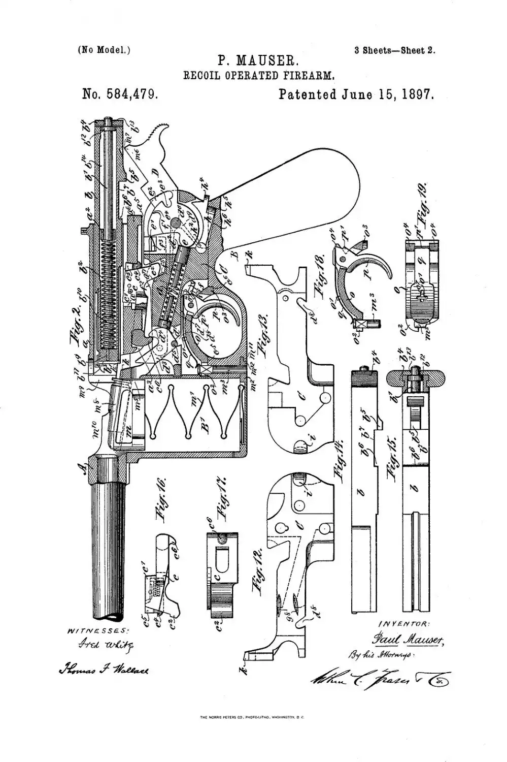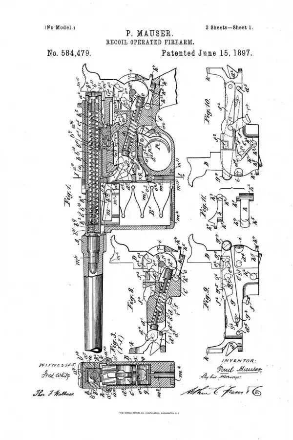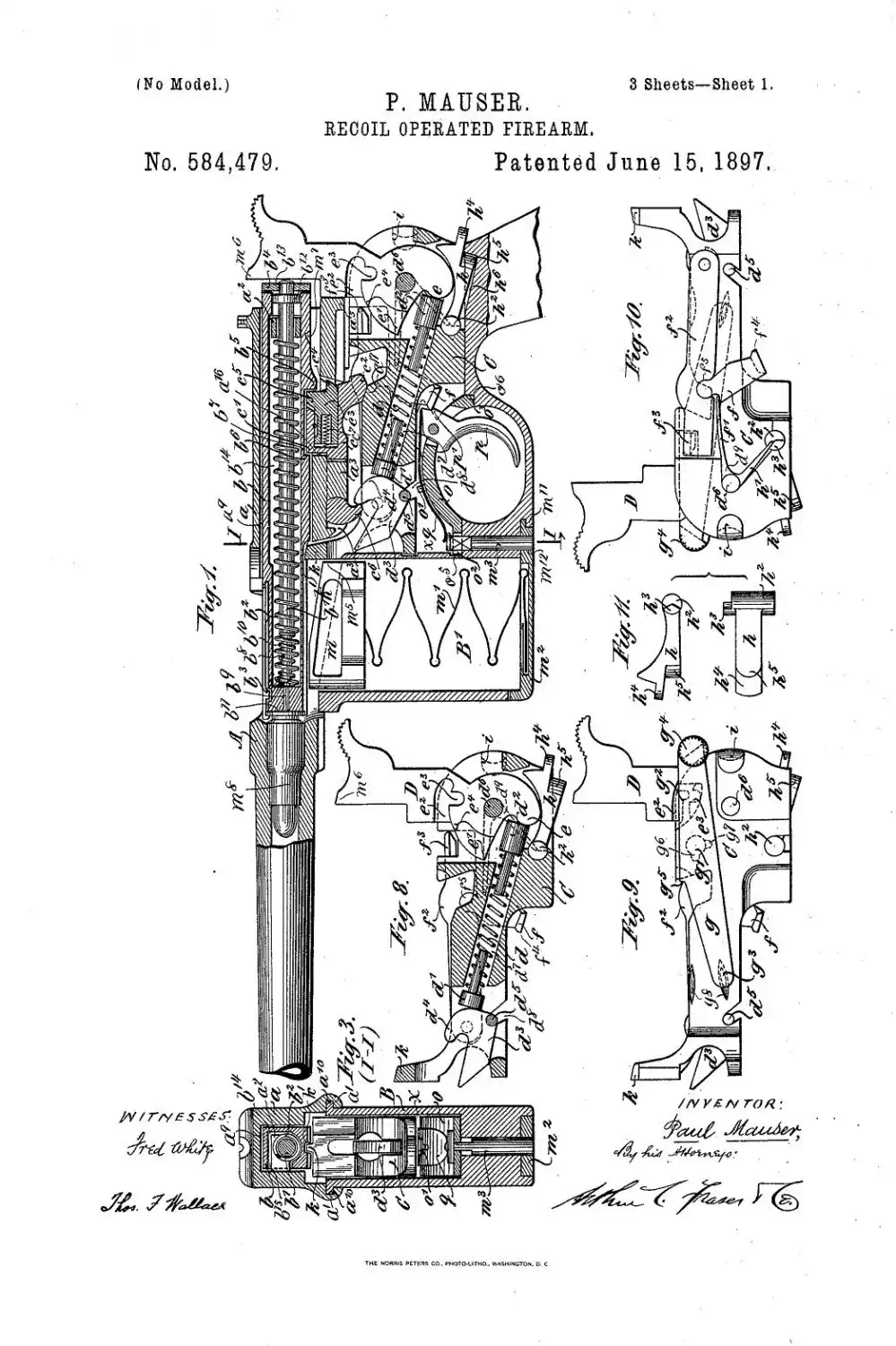 Пауль Маузер подает заявку на регистрацию патента на свой пистолет в многочисленные патентные офисы по всему миру. В Германии рейхспатент зарегистрирован под номером №90430 11 сентября 1895 года, во Франции он получает патент №253098 от 10 января 1896 года, им был получен патент в Великобритании в 1896 году и патент №584479 от 15 июня 1897 года в США.