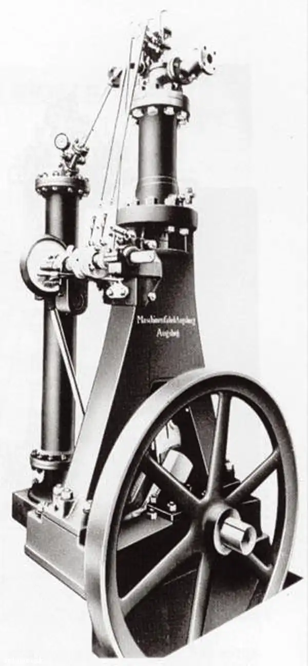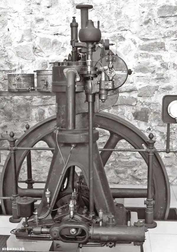 Самый первый из нескольких опытных образцов двигателя Дизеля, в котором проявились недочеты, которые изобретатель никак не мог предусмотреть при теоретических исследованиях