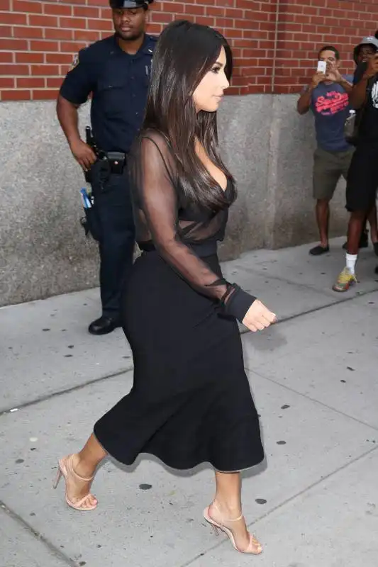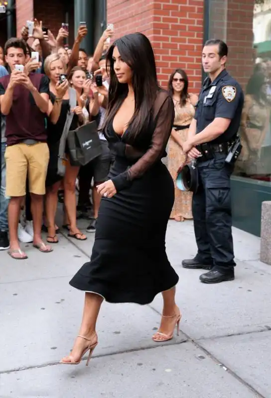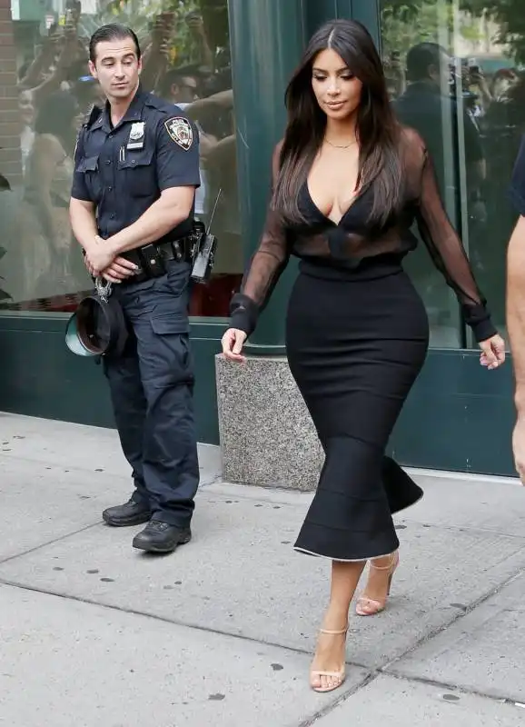 Каждое появление супруги рэпера Канье Уэста на улице сродни шоу, посмотреть на которое собираются десятки зевак и поклонников форм самой знаменитой представительницы клана Кардашьян. Для поддержания порядка на улице перед домом, в котором расположены апартаменты Ким, дежурит полицейский, однако даже страж порядка не удержался от того, чтобы бросить полный восхищения взгляд на формы миссис Уэст. Ким в тот день была одета в полупрозрачную черную блузку и узкую черную юбку ниже колен от французского модного дома Givenchy и босоножки Prada телесного цвета стоимостью 533 доллара. Фасон юбки наилучшим образом подчеркнул главное достоинство Ким — ее ягодицы, происхождение которых будоражит людей во все мире, допытывающихся — натуральны ли они или нет. Ким всегда отрицала их не естественное происхождение и даже делала рентген в прямом эфире одного телешоу, однако источники из ее окружения сообщили прессе, что светская львица прибегала к инъекциям жира из других частей тела для увеличения попы.