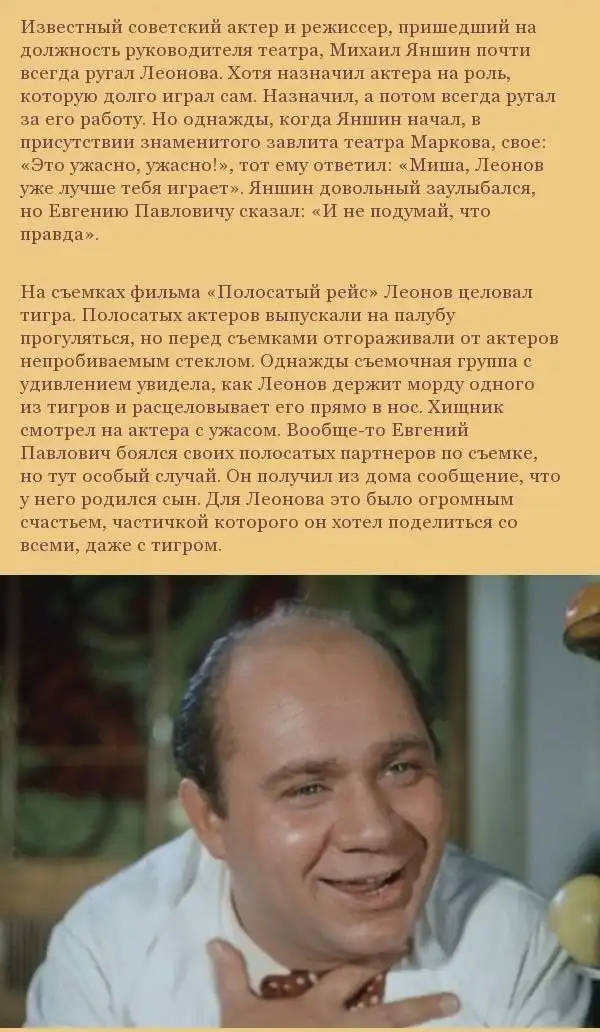 Евгений Леонов был одним из самых известных и горячо любимых советских актеров, хоть в жизни на самом деле Леонов был очень застенчивым человеком и всю жизнь испытывал недостаток тепла и понимания окружающих.