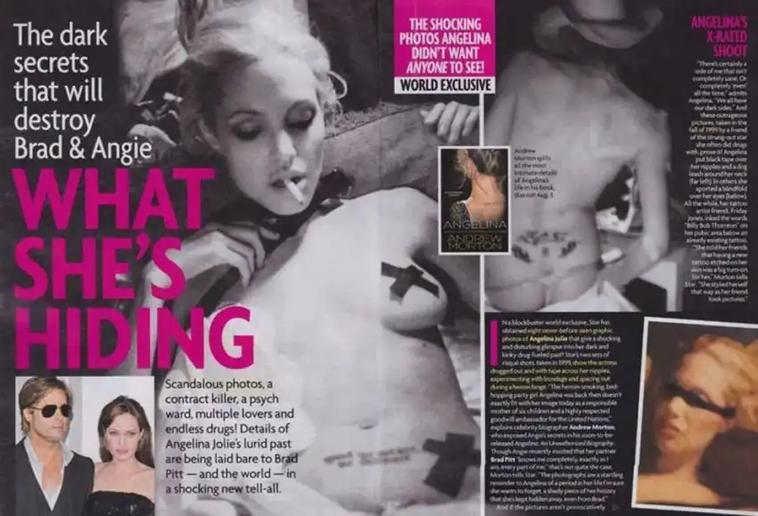Наркотики, удавка на шее и абсолютно обнаженная Анджелина Джоли: восемь компрометирующих актрису снимков опубликовал несколько лет назад американский таблоид Star Magazine. В разгар промо-кампании нового триллера «Солт», который Энджи представляет, мотаясь по всему миру, эти пикантные фото произвели эффект разорвавшейся бомбы. Под снимком актрисы на обложке таблоида красуется надпись: «Ночь, которую Анджелина хотела бы забыть».