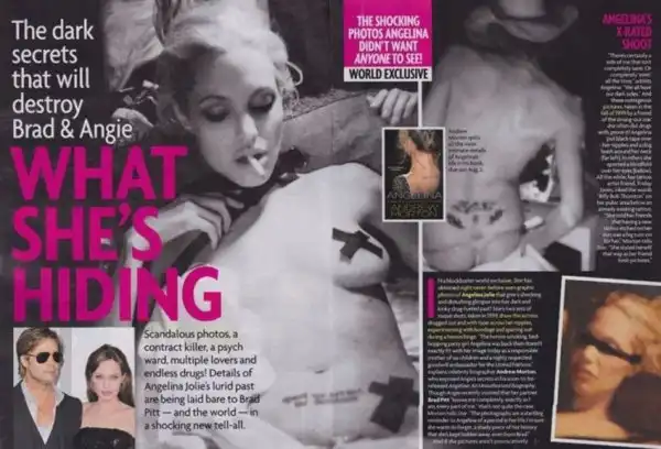 Серия из восьми скандальных фотографий Анджелины была сделана в 1999 году и никогда ранее не издавалась. На черно-белом снимке, опубликованном на обложке таблоида, Анджелина снята топлесс, с косячком в зубах и черным ремнем на шее - то ли ошейником, то ли удавкой. По словам источника, продавшего журналу эти кадры, фото сделаны во время 14-часовой вечеринки с героином и марихуаной. На других снимках 24-летняя Энджи предстает в еще более раскованном виде. На одном актриса абсолютно обнажена, и лишь черная лента, наклееная крест-накрест, прикрывает её соски. На другом - голая Анджелина сидит на кровати, и из предметов туалета на ней - только напоминающие тесемочки стринги и ковбойская шляпа.