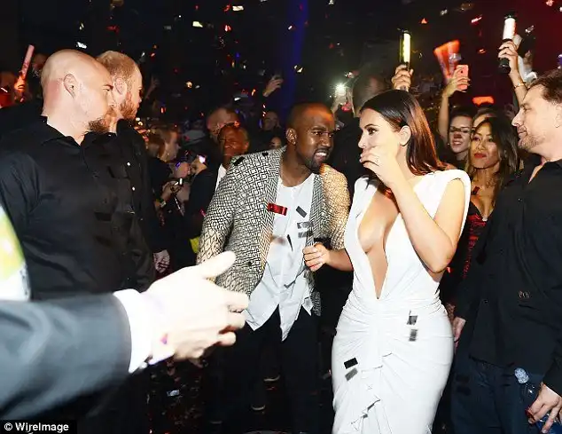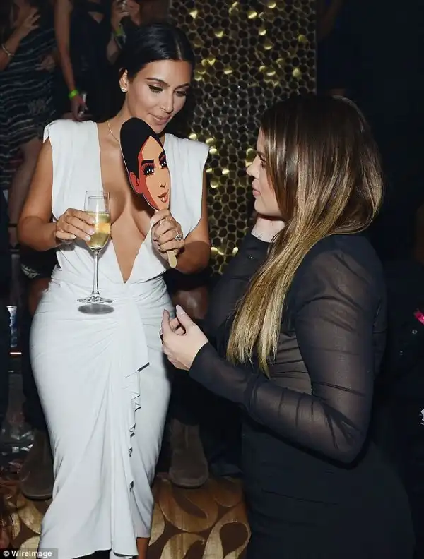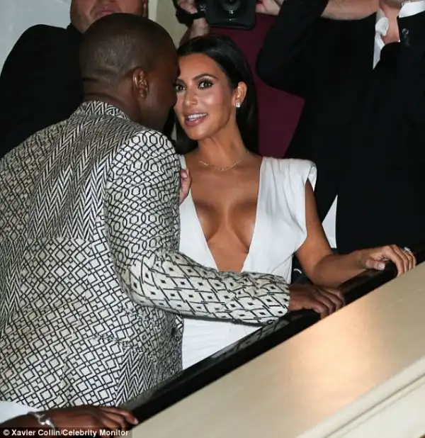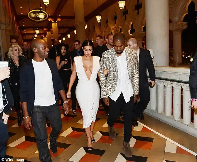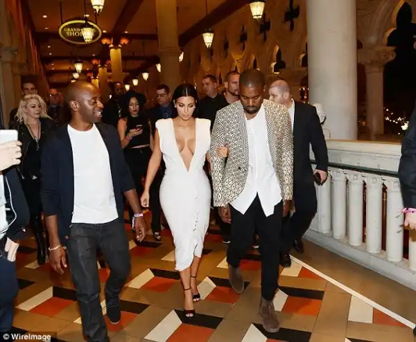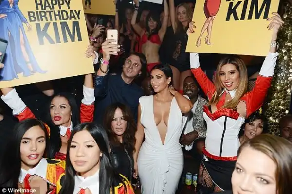 Вечером в пятницу Ким Кардашян и её муж Kanye West в окружении близких друзей отметили её 34-летний день рождения. Вечеринка проходила в ночном клубе TAO в Лас-Вегасе, Ким была одета в белом платье с глубоким декольте.